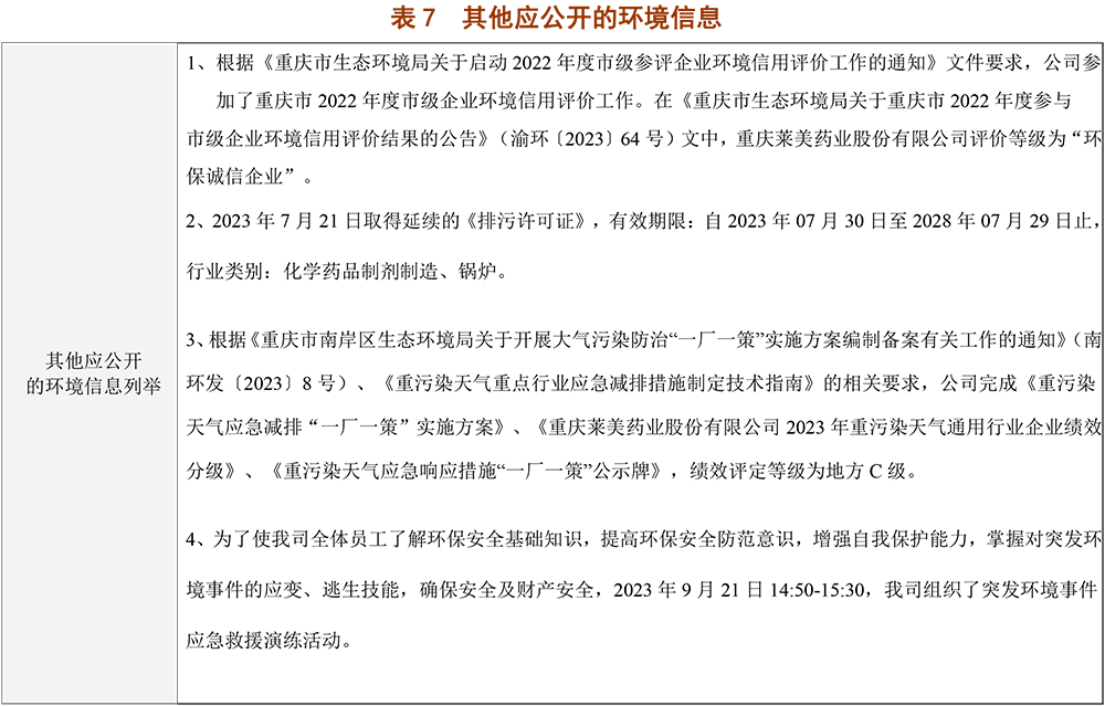重慶萊美藥業股份有限公司2023年環境信息公開表